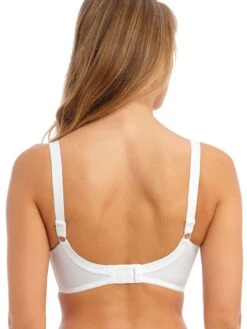 Freya Daisy Lace Balcony bra up to a K cup in colour White. This bra provides a deeper wire for great coverage, support and comfort. The lined bottom cup also adds support and shape. Its lace top cup has stretch lace for ease of fit. Finished with a cute bow and silver triangle embellishment.